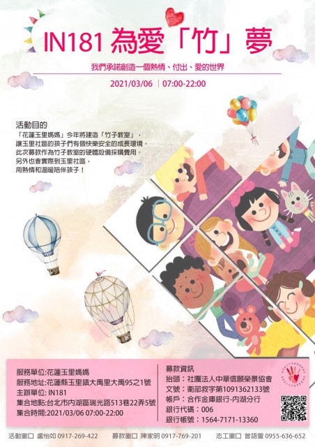 目前急需經費來添購教室內的硬體設備,包含教室桌椅、資訊設備、遠端學習設 備...等。在此,藉由IN181的力量,募款硬體設備的經費來源,為孩子們創造有更 多可能性的未來。