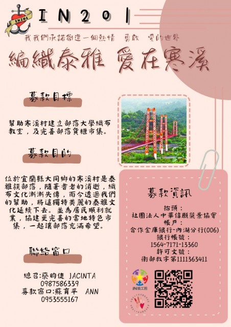 IN201主辦『大同鄉寒溪村部落大學教室經費補助募款活動』已順利募款完畢,感謝社會大眾的愛心,一起『為世界貢獻一份愛,延續獨特傳統文化!』